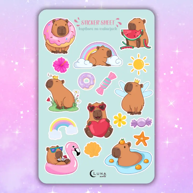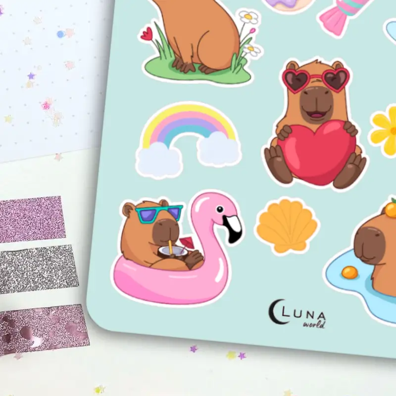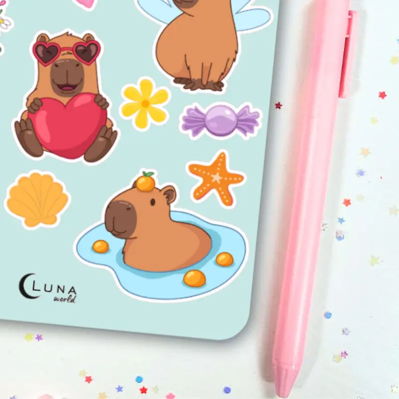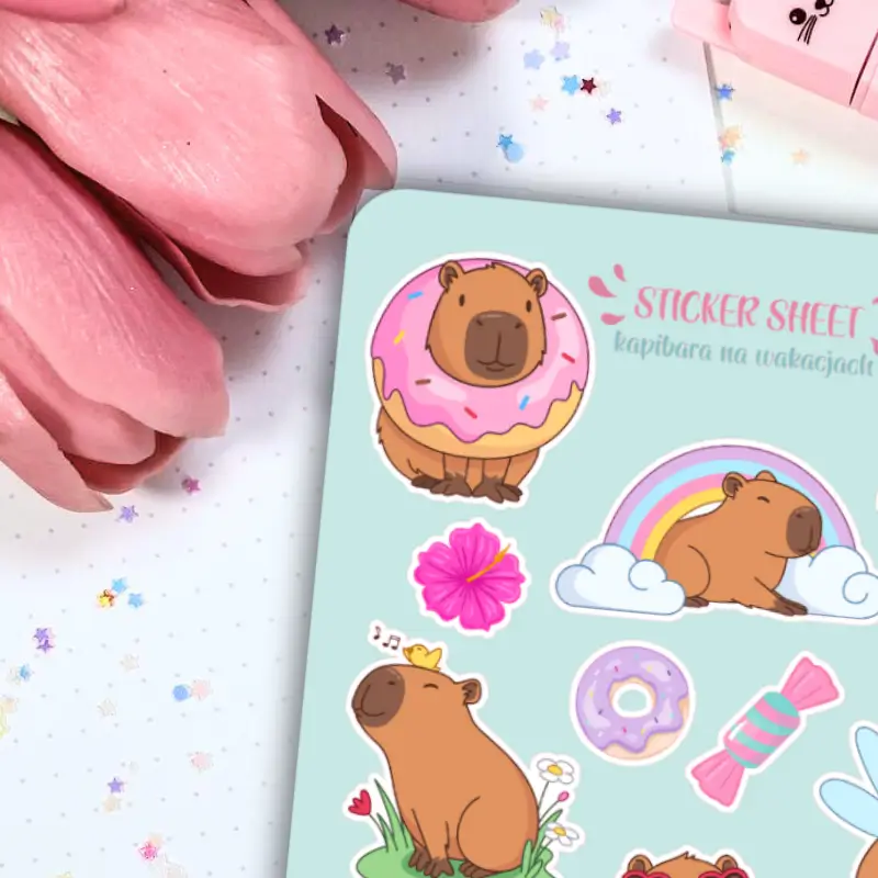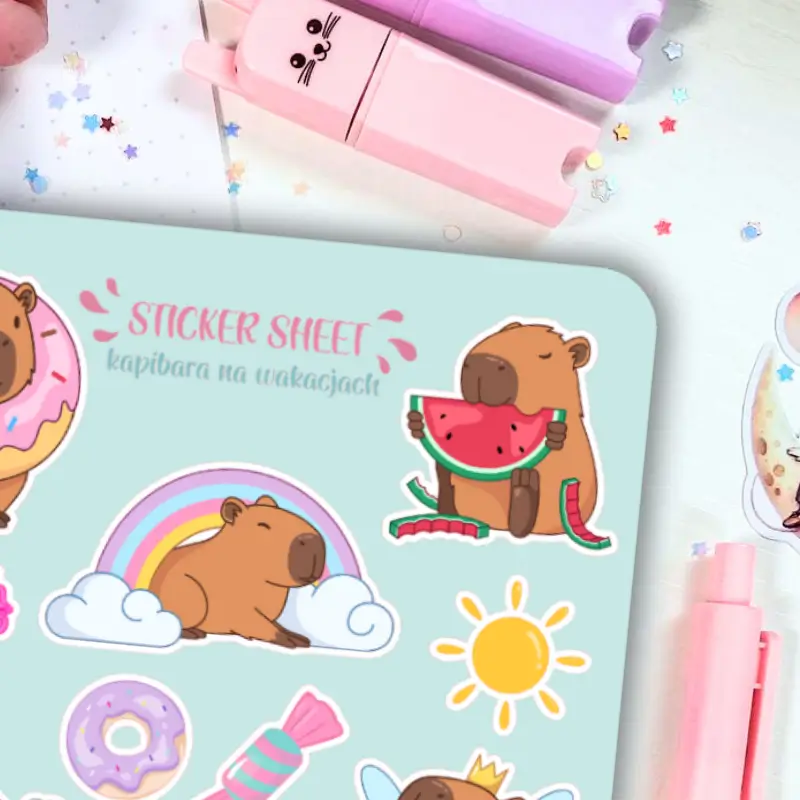 Jeśli lubisz delikatne, kolorowe naklejki to zestaw stworzony z myślą o Tobie. Arkusz naklejek akwarelowych z uroczymi kapibarami ozdobi Twój planner, dziennik mola książkowego, bullet journal czy zeszyt. Arkusz naklejek zawiera 17 sztuk papierowych naklejek. Stwórz ze zwykłego zeszytu idealny planner dostosowany do Twoich potrzeb.