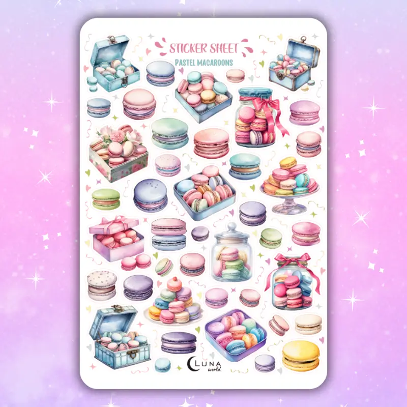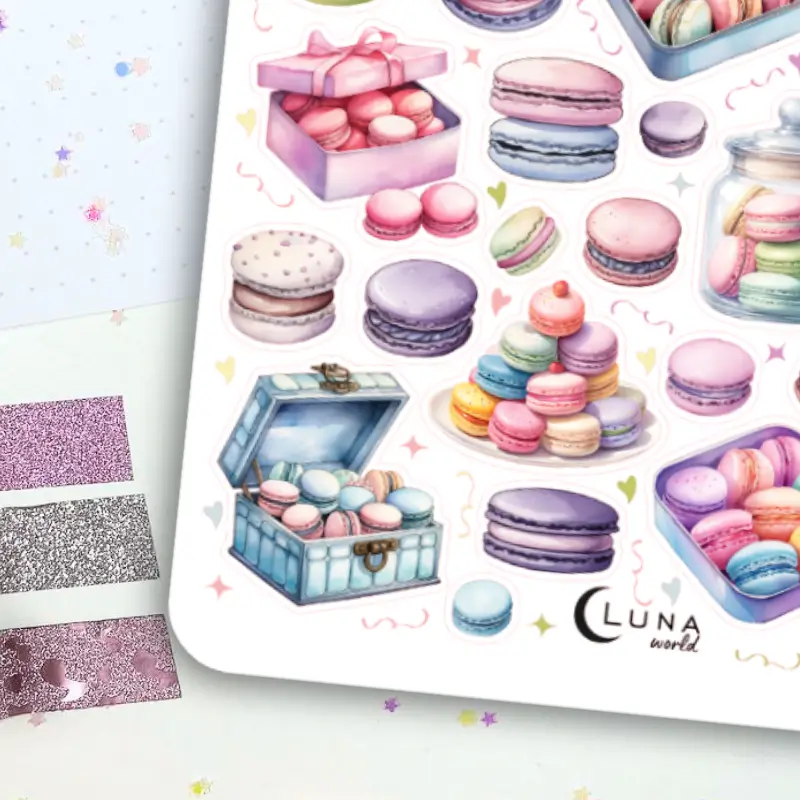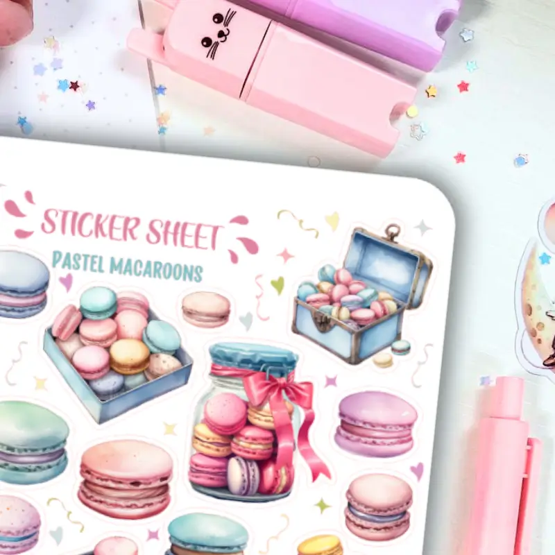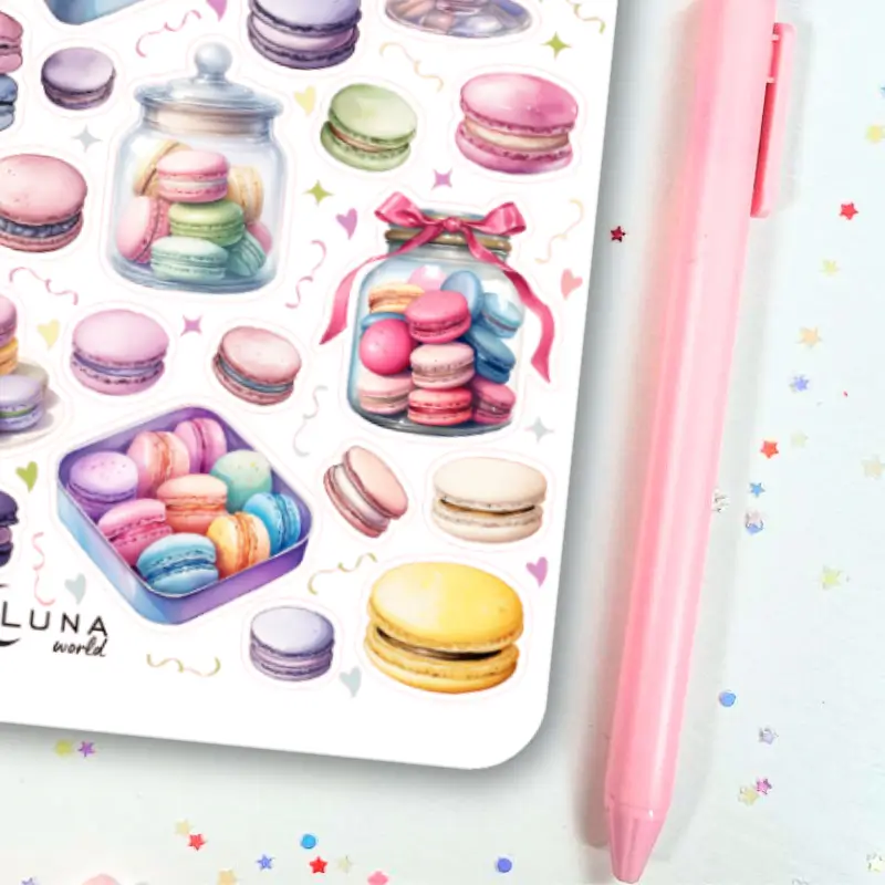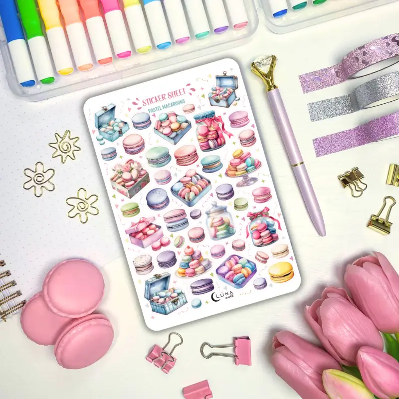 Jeśli lubisz kolorowe naklejki to zestaw stworzony z myślą o Tobie! Arkusz naklejek z pastelowymi makaronikami ozdobi Twój planner, bullet journal czy zeszyt. Arkusz naklejek zawiera 42 sztuk papierowych naklejek. Stwórz ze zwykłego zeszytu idealny planner dostosowany do Twoich potrzeb.