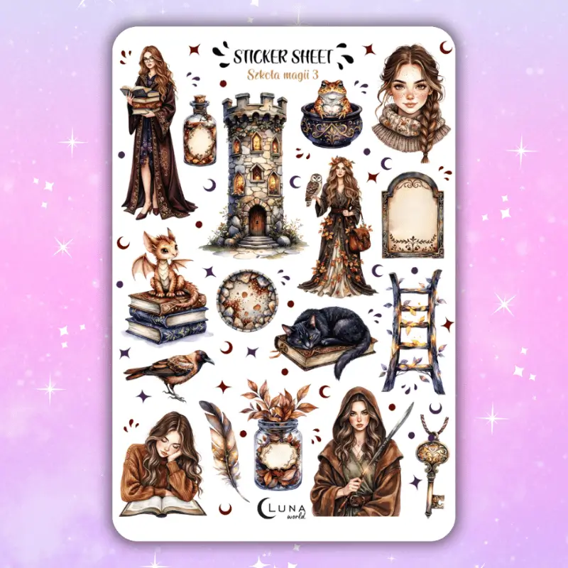 Jeśli lubisz magiczne, tajemnicze naklejki to zestaw stworzony z myślą o Tobie. Arkusz naklejek akwarelowych z motywem magicznego świata ozdobi Twój planner, bullet journal czy zeszyt. Arkusz naklejek zawiera 17 sztuk papierowych naklejek.