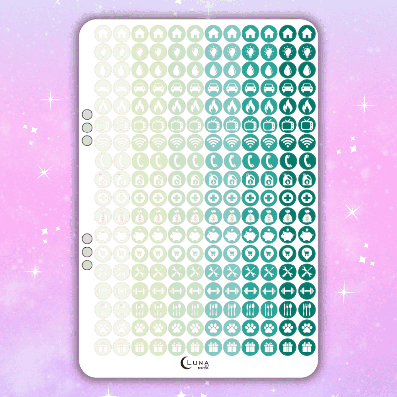 Arkusz naklejek składa się z 216 naklejek w zielonym odcieniu. Ikonki koloru białego. Możliwość wpięcia do organizera.