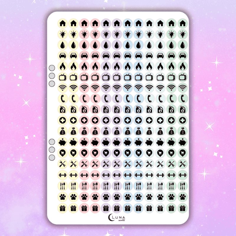 Zestaw pastelowych naklejek ułatwiających planowanie wydatków oraz wyróżniające zdarzenia w planerze finansowym.
