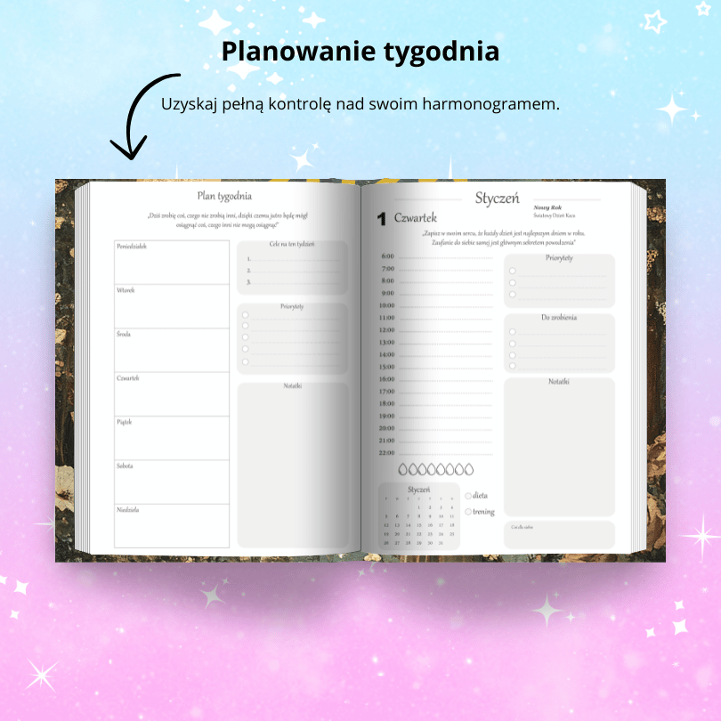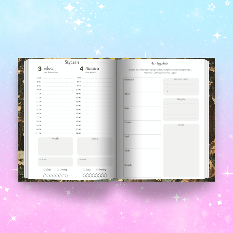 PLANER 2026 ROK MAGII I MARZEŃ to miejsce, w którym Twoje plany spotykają się z intuicją, a codzienność z marzeniami. Czarująca okładka i wnętrze pełne przestrzeni na zapiski, intencje i rytuały – to planer dla tych, które kochają nocne niebo, ciszę, światło świec i opowieści o wróżkach. Twórz swój rok z odrobiną magii – dzień po dniu. Kalendarz został wyprodukowany w Polsce z dbałością o szczegóły, by towarzyszyć Ci przez cały rok w realizacji celów, organizacji czasu i dbaniu o siebie.